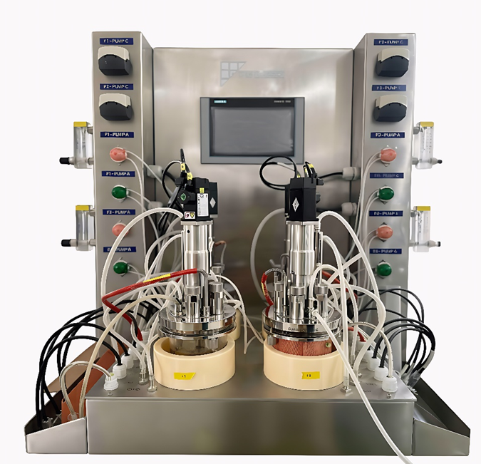 - Top driven with mechanical seal and Rushton Turbine/Marine Impellers with removable baffles with precision rpm controlled with servo motor.